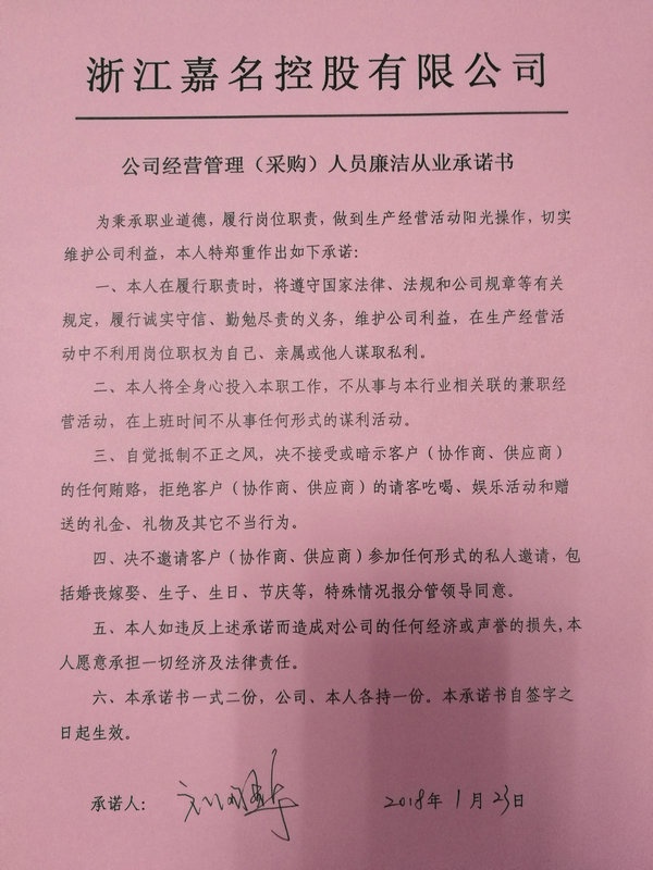 1月23日,公司召開(kāi)經(jīng)營(yíng)管理(采購)人員廉潔從業(yè)承諾書(shū)簽訂會(huì )議,11名公司廉潔風(fēng)險重點(diǎn)崗位的經(jīng)營(yíng)管理(采購)人員參加會(huì )議,并簽訂了廉潔從業(yè)承諾書(shū)。公司莫總和黨建指導員吳紀聯(lián)分別講話(huà)。