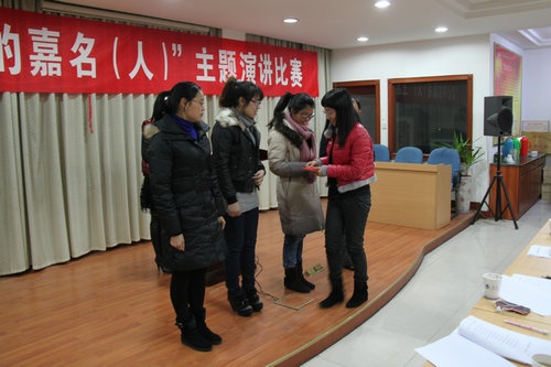 12月17日晚,公司工會(huì )、團支部聯(lián)合舉辦的 “我心中的嘉名(人)”主題演講比賽,12名選手參加了比賽。李丹華獲一等獎,范曉磊、張金金獲二等獎,宋建會(huì )、陳華芳、楊 麗獲三等獎,陸松芬、謝建甫、衛建秋、鐘曉蘭、黃孝軍、陳慧琴獲鼓勵獎。鳳鳴街道黨委委員吳霞萍,公司總經(jīng)理莫炳榮為獲獎選手頒獎。